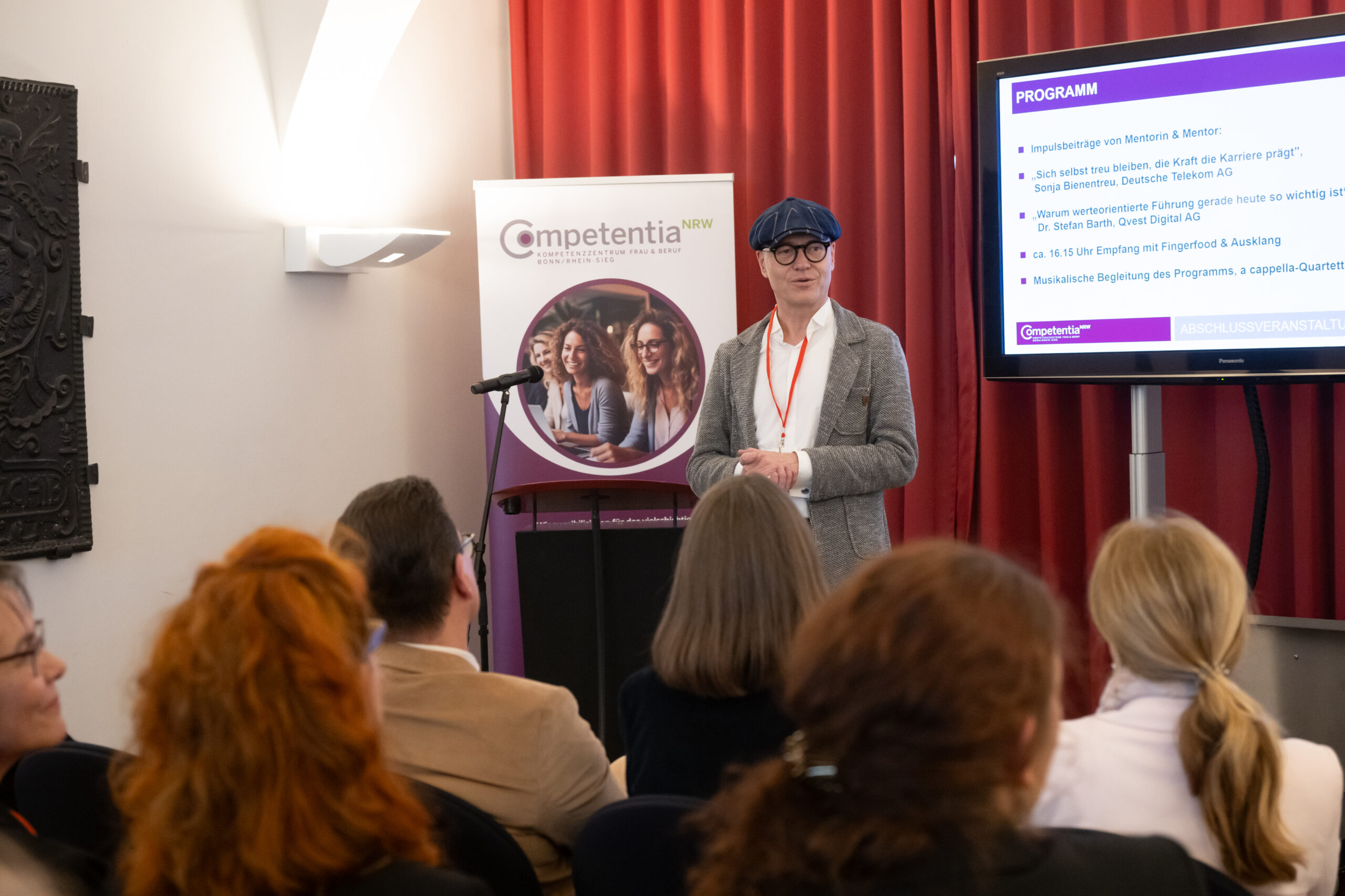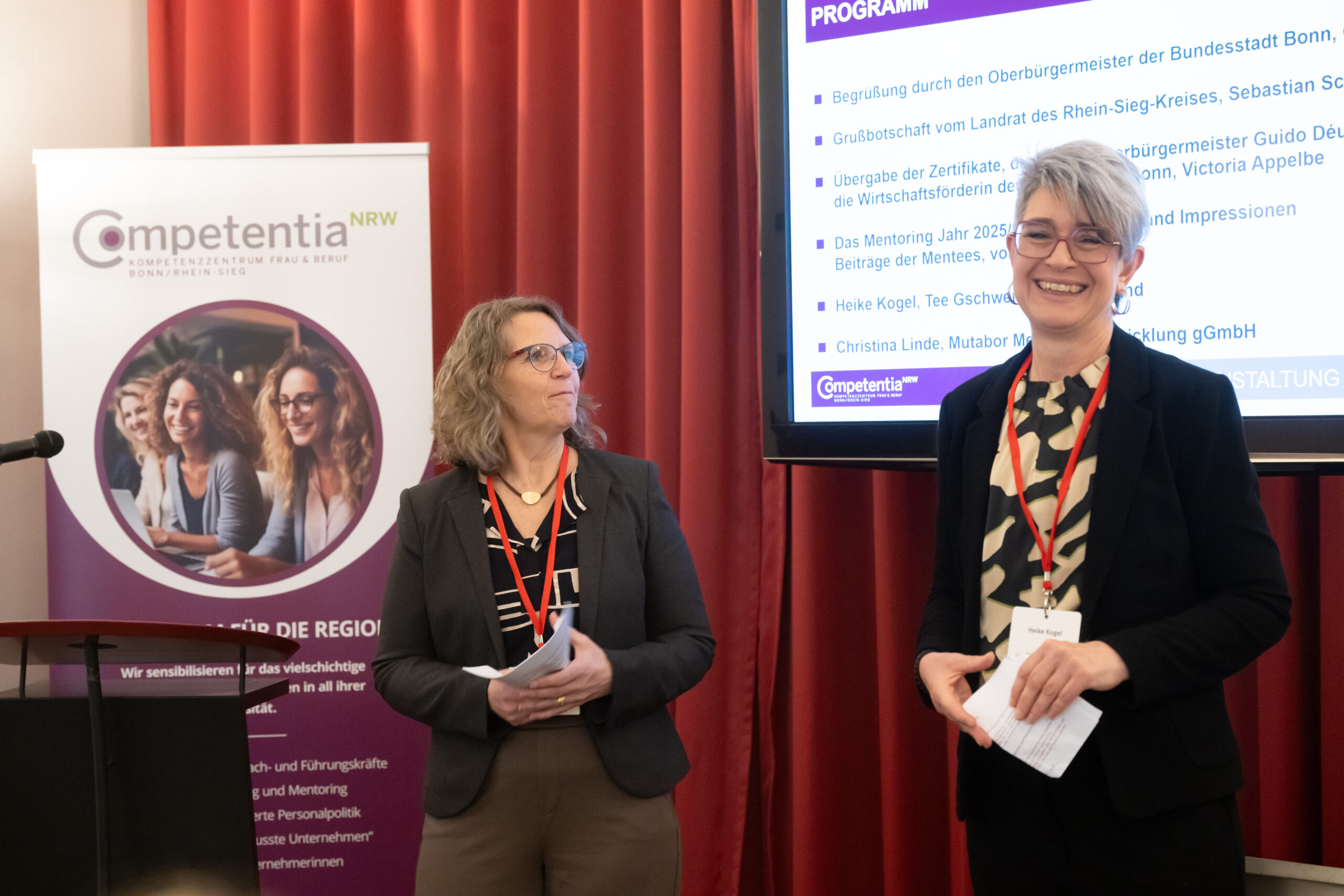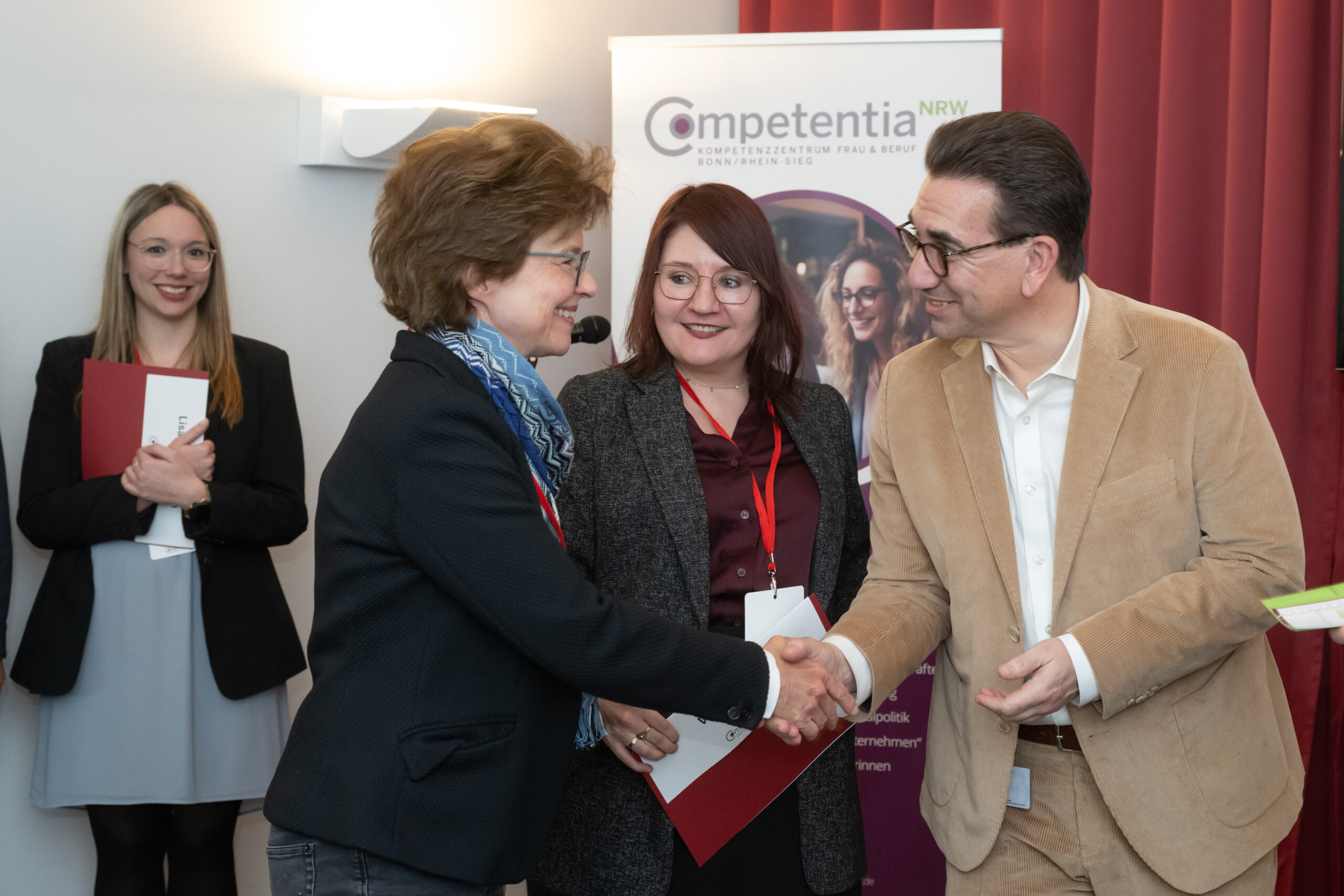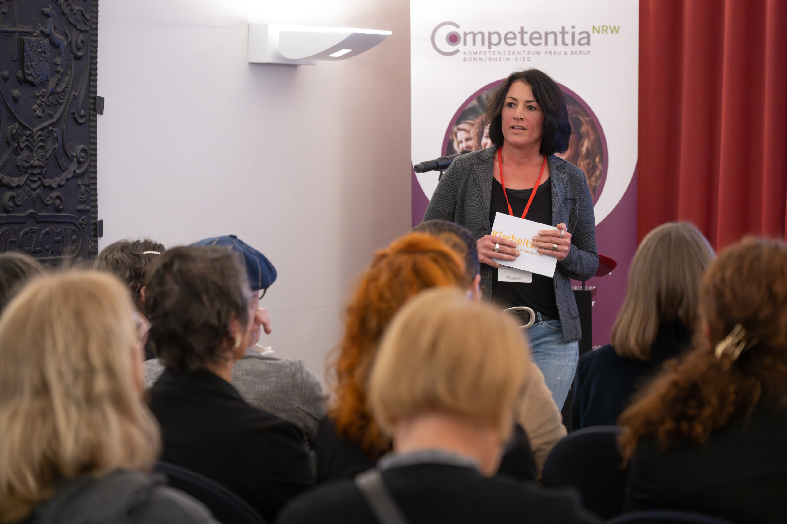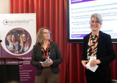 Dass das Thema in Bonn und im Rhein-Sieg-Kreis ernst genommen wird, zeigten auch Guido Déus und Regina Rosenstock in Vertretung für Landrat Schuster. Déus verdeutlichte: „Für eine gleichberechtigte Teilhabe von Frauen am Arbeitsleben brauchen wir bessere Rahmen- und Arbeitsbedingungen.“  Sebastian Schuster unterstrich in seiner Grußbotschaft die Bedeutung weiblicher Fach- und Führungskräfte, gerade mit Blick auf den Fachkräftemangel. Und Victoria Appelbe betonte: „Wir haben eine exzellent ausgebildete Frauengeneration auf dem Arbeitsmarkt. Weibliche Fach- und Führungskräfte sind für die Unternehmensentwicklung und wirtschaftlichen Erfolg unverzichtbar“.